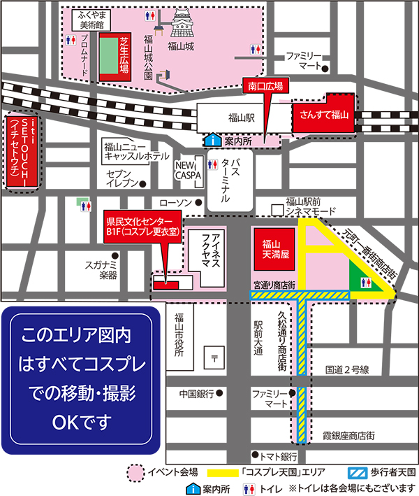 会場はJR福山駅周辺の商店街&商業施設&映画館&福山城公園の歩いて回遊できるエリアとJR福山駅から車で約30分のアミューズメントパーク。コスプレ、コスプレパフォーマンス、声優&VTuber&クリエイターステージ、アニソンライブ、同人マンガ・小説の展示販売、自主制作アニメのコンペティション、プラモデル・フィギュア展示、リアル謎解きゲームなど多彩なコンテンツが楽しめます。